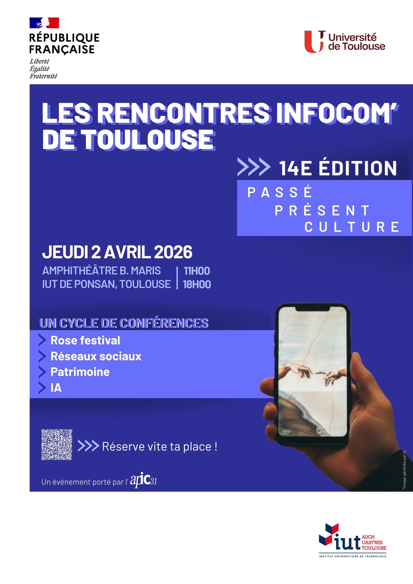 Le 2 avril, l’IUT de Toulouse accueille une nouvelle édition des RIC autour du thème : Passé, présent, culture. Une journée pour explorer la communication culturelle, la valorisation des archives et du patrimoine 📚 Au programme : échanges, partages d’expérience et regards croisés avec des professionnels du secteur.